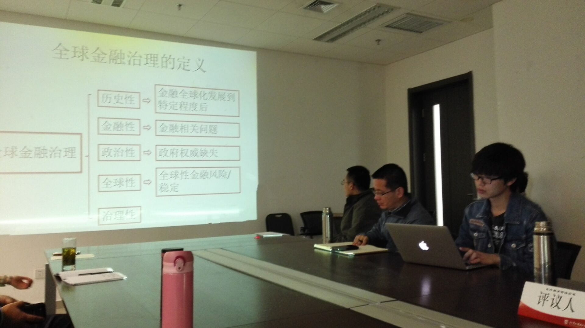 尹继武老师对张博士的演讲进行了简短的总结。他认为张先生具有很强的学术创新意识,这是当前这一领域的研究中最难能可贵的;并且他对全球金融治理进行了完整的梳理,对在座学生和老师的思考都有很大的启发。总结完毕,尹老师邀请杨毅老师和康晓老师进行评议。