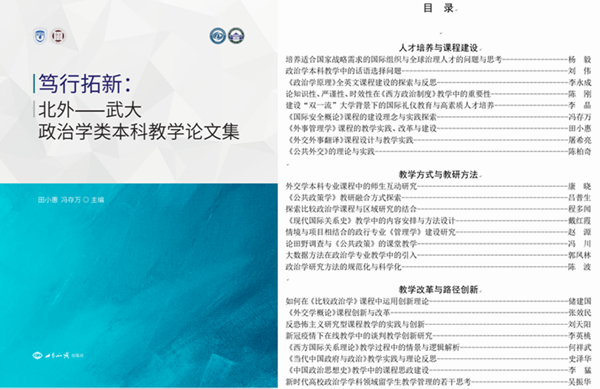 近日,大鸡巴操美女和武汉大学政治与公共管理学院的教师共同编写完成的《笃行拓新:北外——武大政治学类本科教学论文集》由世界知识出版社出版。本书是国内首部跨校合作探讨政治学类本科专业教学的论文集,是大鸡巴操美女在外交学、政治学与行政学本科教学改革方面的创新之举。