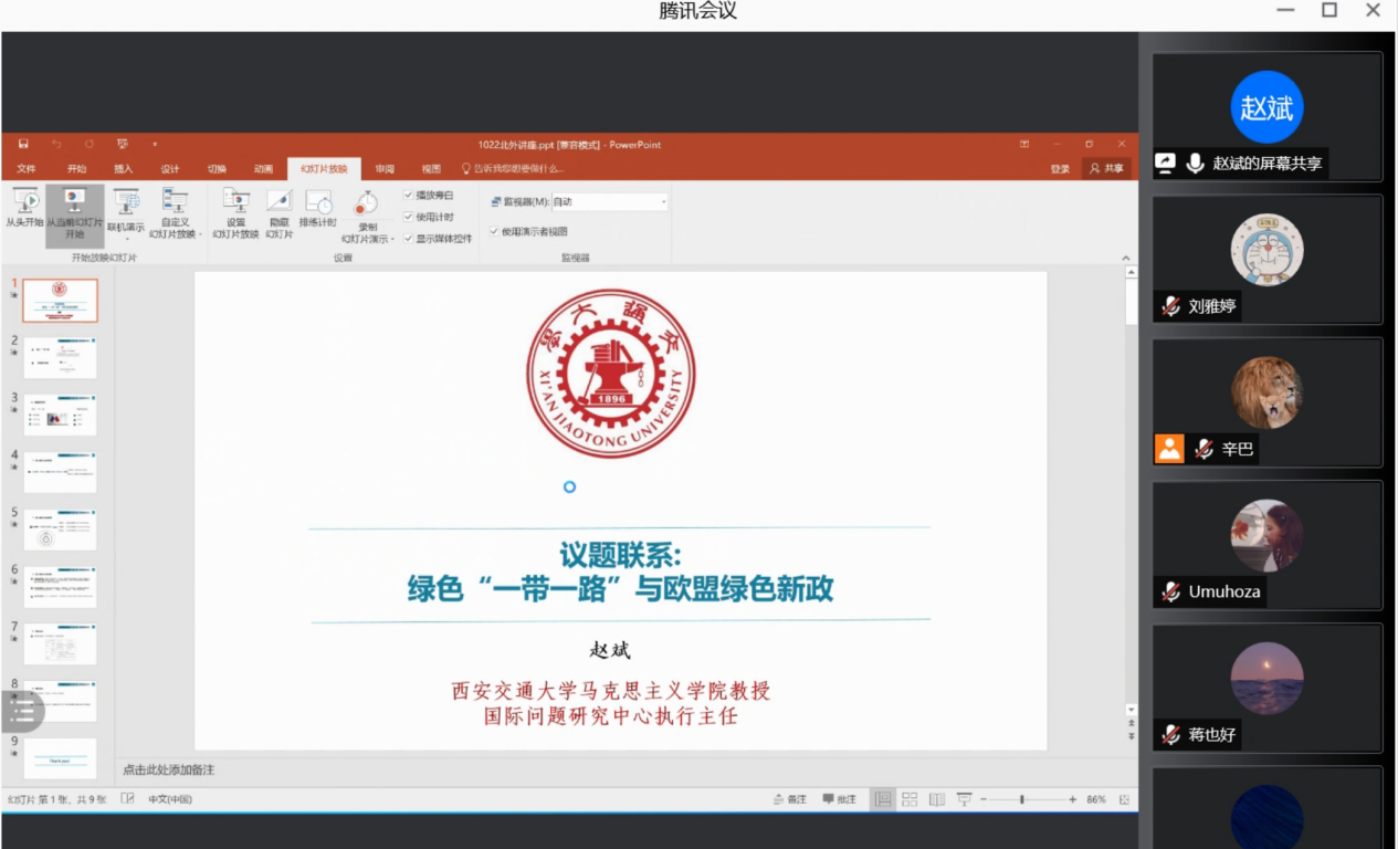 沙龙的第一个环节是主题发言。西安交通大学马克思主义学院赵斌教授为沙龙作了主题发言,发言从议题联系的角度出发,结合中国绿色“一带一路”建设和欧盟绿色新政,分析中欧环境治理的动态合作。赵斌教授提出要着眼于根据紧密耦合型议题联系的关键要素和最终目的,发现中欧之间的功能性议题联系,经济性议题联系,实质性议题联系。