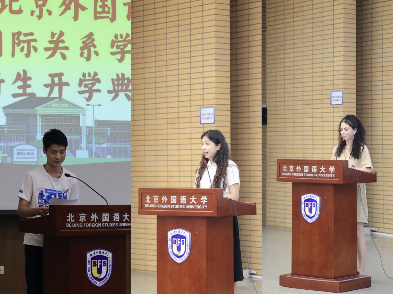 接下来,22级外交学(中外合作办学)专业的彭李思瀚同学作为新生代表发言。彭李思瀚同学首先表达了对提供帮助的老师、学长学姐们的感谢,并表达了对于来到北外的欣喜、对于大学生活的憧憬,也立志以诸多优秀校友为榜样,号召同学们对自己未来的学习与发展提出更高期待与要求。