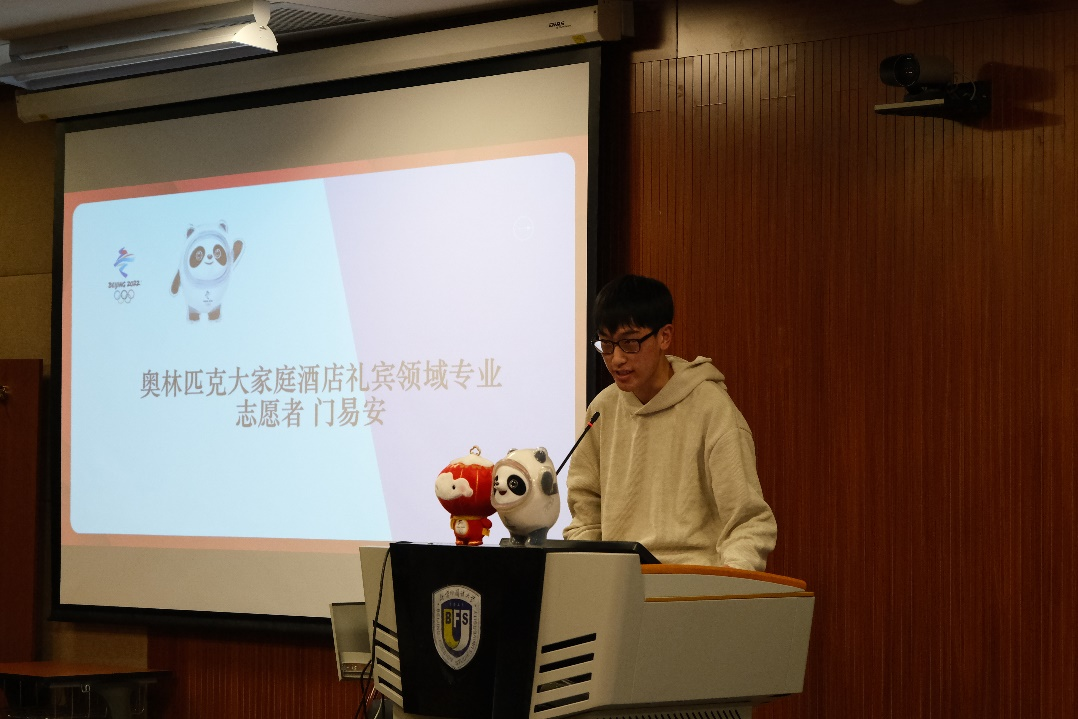 门易安同学讲述了自己作为奥林匹克大家庭酒店礼宾领域专业志愿者的日常工作,如为国际国内贵宾会见、宴请等提供安排,检查酒店内的礼旗等。他分享了自己的奥运历程,表达了作为志愿者做好冬奥服务的决心,立志让志愿者的微笑在2008年北京奥运会后再次成为中国的名片。