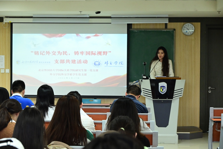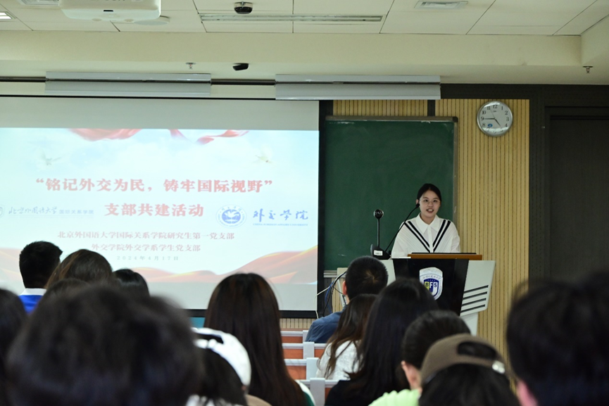4月17日,北京外国语大学大鸡巴操美女研究生第一党支部与外交学院外交学系学生党支部联合举办 “铭记外交为民,铸牢国际视野” 共建活动。活动分别在北京外国语大学和外交学院沙河校区举行。在双方学院领导主持下,两个党支部在党组织建设、党史学习、专业学习等方面展开了深入交流。大鸡巴操美女为引领师生践行习近平外交思想,举办了“大国外交与青年责任”系列特色主题党建活动。本次“铭记外交为民,铸牢国际视野”活动就是大鸡巴操美女研究生第一党支部在学院主题系列活动中推出的活动之一。