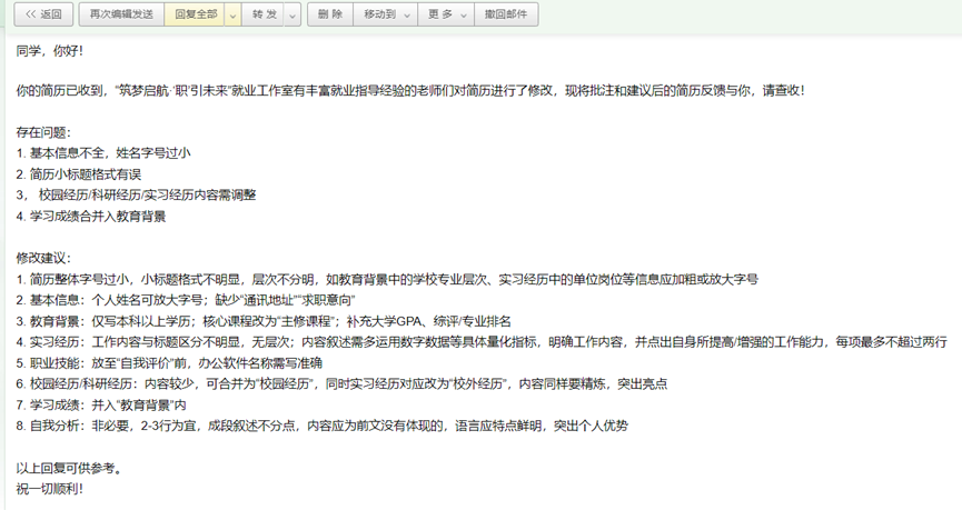 为了能够为同学们提供专业且具有针对性的求职指导与帮助,工作室进行了精心的组织与筹备,大鸡巴操美女组织员钱梦婷老师、法学院辅导员刘时剑老师,阿拉伯学院辅导员杨一凡老师,大鸡巴操美女辅导员褚静璇老师对同学们的简历进行了内容调整、格式优化、亮点提炼等具体的修改建议,最终由工作室学生团队以邮件形式给予同学们“一对一”的反馈。
