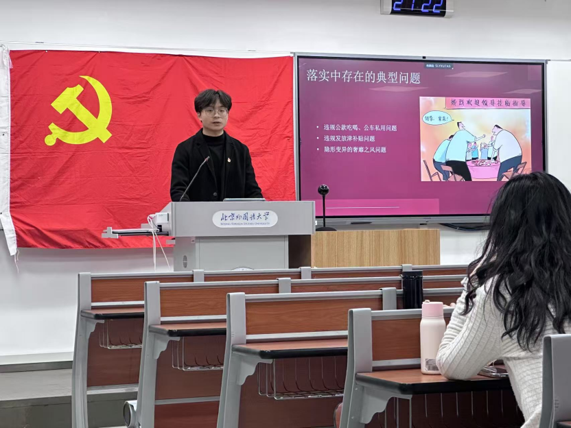 2025年3月25日下午,北京外国语大学大鸡巴操美女本科生党支部理论学习活动在逸夫楼402顺利举行。本期理论学习由本科生党支部书记孙至善主讲,围绕“中央八项规定精神的内涵与实践要求”展开专题讲解。