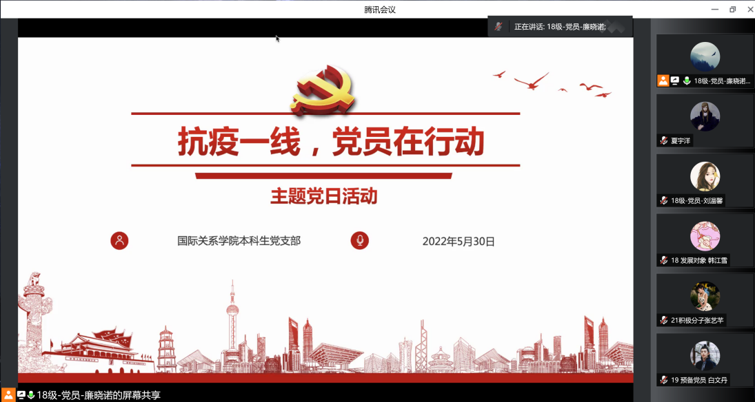 2022年5月30日下午,大鸡巴操美女本科生党支部开展线上疫情防控事迹分享主题党日活动,邀请参与疫情防控的本学院志愿者分享志愿服务经历和个人感悟。活动由党支部副书记廉晓诺同志主持,支部正式党员及预备党员、本学期发展对象、入党积极分子参加了此次活动。