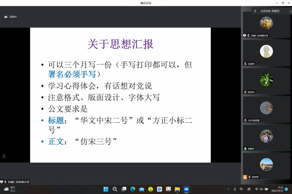 张慧芬老师首先向同学们介绍了北京外国语大学校内党员发展指标的分配原则与流程,向同学们介绍了党员指标如何公平地分配到各单位。之后张慧芬老师为同学们介绍入党的整个流程,详细讲述了从提交入党申请书到成为积极分子、发展对象、预备党员再到最终成为正式党员的全过程,并且为同学们详尽地解释了这一过程中的表格填写、材料提交、接收会议与表决等诸多注意事项,让同学们对入党的流程以及规范有了较为深入的了解。