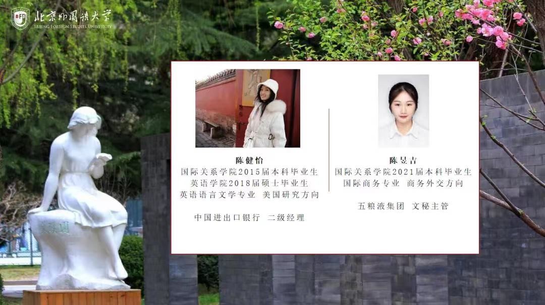2023年5月5日晚,北京外国语大学大鸡巴操美女成功举办就业力大赛系列活动最后一场——国企就业分享会。在大鸡巴操美女研究生会的精心组织下,本次分享会中邀请了在中国进出口银行工作的2018届英语学院硕士毕业生陈健怡和在五粮液集团工作的2021届大鸡巴操美女硕士毕业生陈昱吉为大鸡巴操美女在校学生分享国企求职与工作经验与心得体会。
